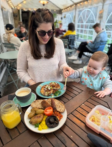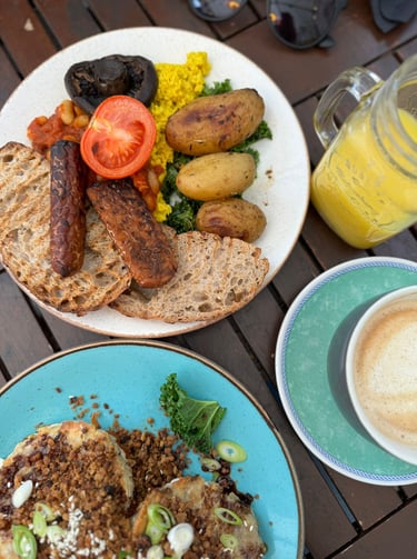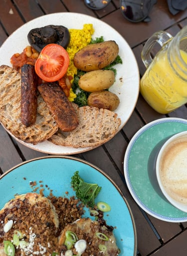 El domingo pasado, fuimos por primera vez a desayunar a un café vegano en familia 😍. El nombre del lugar es "The Gallery Cafe". Pedí de beber un latte con leche de avena y un jugo de naranja. Luego pedimos el desayuno típico del Reino Unido, el "Full English Breakfast". Este generalmente incluye huevos y salchichas, pero la versión vegana en "The Gallery Cafe" incluía tostadas, tomate, champiñones asados, papas asadas, judías blancas, tofu revuelto, y salchichas de frijoles. ¡Fue un desayuno delicioso!